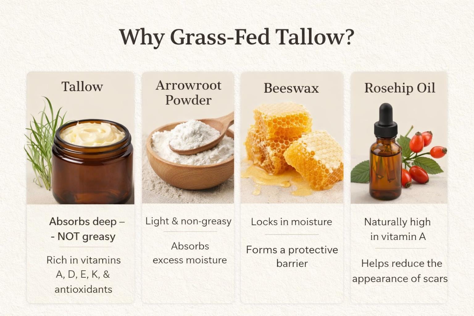 Our tallow moisturizer is made from grass-fed beef tallow—rich in nutrients and incredibly similar to your skin’s natural oils.
